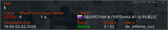 Последний раз был в сети 16:56 02.02.2026 Игрок с таким ником замечен на 40 серверах