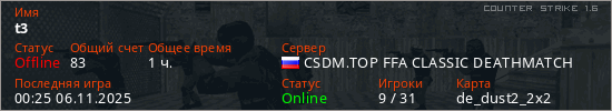 Последний раз был в сети 00:25 06.11.2025 Игрок с таким ником замечен на 6 серверах