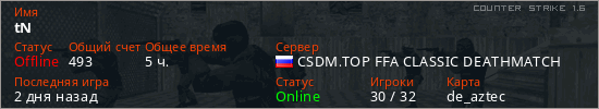 Играет на Counter Strike 1.6 сервере. Страна: РоссияПервый раз замечен 19:28 14.02.2020