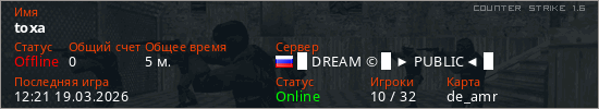 Играет на Counter Strike 1.6 сервере. Страна: РоссияПервый раз замечен 12:17 19.03.2026