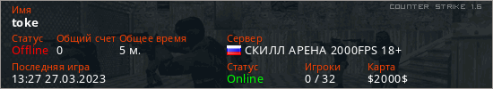 Играет на Counter Strike 1.6 сервере. Страна: РоссияПервый раз замечен 13:23 27.03.2023