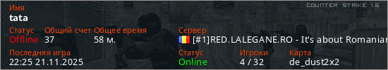 Играет на Counter Strike 1.6 сервере. Страна: РумынияПервый раз замечен 20:13 11.06.2022