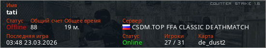 Играет на Counter Strike 1.6 сервере. Страна: РоссияПервый раз замечен 20:50 22.03.2026