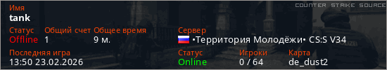 Играет на Counter Strike Source сервере. Страна: РоссияПервый раз замечен 19:54 12.02.2026