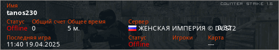 Играет на Counter Strike 1.6 сервере. Страна: РоссияПервый раз замечен 11:28 19.04.2025