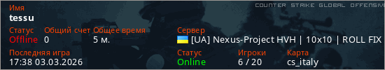 Играет на Counter Strike Global Offensive сервере. Страна: УкраинаПервый раз замечен 17:29 03.03.2026