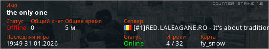 Играет на Counter Strike 1.6 сервере. Страна: РумынияПервый раз замечен 19:45 31.01.2026