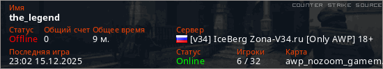 Играет на Counter Strike Source сервере. Страна: РоссияПервый раз замечен 22:46 30.11.2025