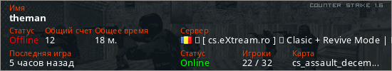 Играет на Counter Strike 1.6 сервере. Страна: РумынияПервый раз замечен 18:15 05.12.2025