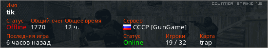 Играет на Counter Strike 1.6 сервере. Страна: РоссияПервый раз замечен 18:30 15.02.2026