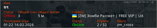 Играет на Counter Strike 1.6 сервере. Страна: УкраинаПервый раз замечен 23:57 15.02.2026