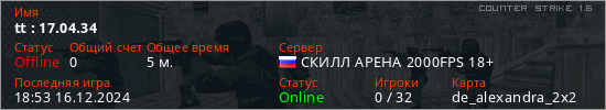 Играет на Counter Strike 1.6 сервере. Страна: РоссияПервый раз замечен 18:28 16.12.2024