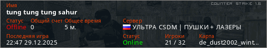 Играет на Counter Strike 1.6 сервере. Страна: РоссияПервый раз замечен 22:39 29.12.2025