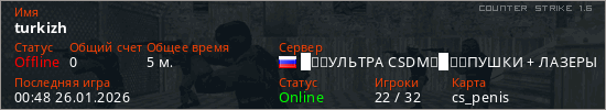 Играет на Counter Strike 1.6 сервере. Страна: РоссияПервый раз замечен 00:44 26.01.2026