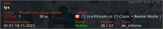 Играет на Counter Strike 1.6 сервере. Страна: РумынияПервый раз замечен 04:22 03.09.2025