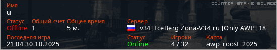Играет на Counter Strike Source сервере. Страна: РоссияПервый раз замечен 21:02 30.10.2025