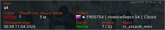 Играет на Counter Strike 1.6 сервере. Страна: РоссияПервый раз замечен 00:21 11.04.2026