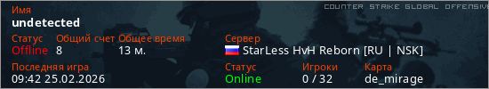 Играет на Counter Strike Global Offensive сервере. Страна: РоссияПервый раз замечен 19:48 24.02.2026