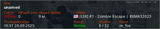 Играет на Counter Strike 1.6 сервере. Страна: СШАПервый раз замечен 01:48 20.09.2025