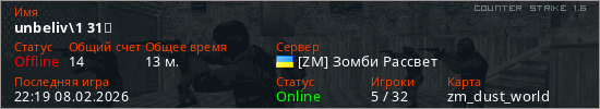 Играет на Counter Strike 1.6 сервере. Страна: УкраинаПервый раз замечен 21:58 08.02.2026