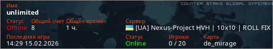Играет на Counter Strike Global Offensive сервере. Страна: УкраинаПервый раз замечен 10:48 08.02.2026