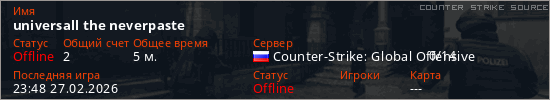 Играет на Counter Strike Source сервере. Страна: РоссияПервый раз замечен 23:39 27.02.2026