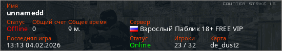 Играет на Counter Strike 1.6 сервере. Страна: РоссияПервый раз замечен 09:08 02.02.2026