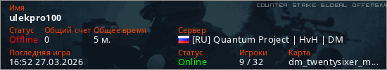Играет на Counter Strike Global Offensive сервере. Страна: РоссияПервый раз замечен 16:22 27.03.2026