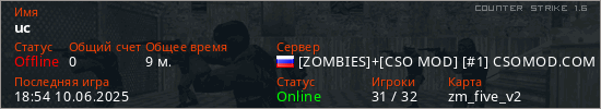 Играет на Counter Strike 1.6 сервере. Страна: РоссияПервый раз замечен 05:37 10.06.2025