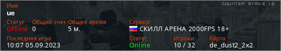 Играет на Counter Strike 1.6 сервере. Страна: РоссияПервый раз замечен 10:03 05.09.2023