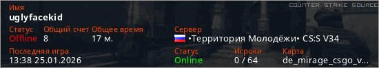 Играет на Counter Strike Source сервере. Страна: РоссияПервый раз замечен 23:05 18.01.2026