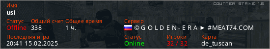 Играет на Counter Strike 1.6 сервере. Страна: РоссияПервый раз замечен 12:51 14.02.2025