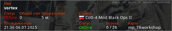 Играет на Call of Duty 4: Modern Warfare сервере. Страна: РоссияПервый раз замечен 21:32 06.07.2025