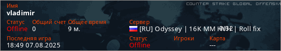 Играет на Counter Strike Global Offensive сервере. Страна: РоссияПервый раз замечен 07:43 07.08.2025