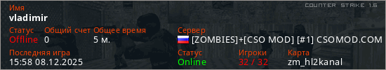 Играет на Counter Strike 1.6 сервере. Страна: РоссияПервый раз замечен 15:55 08.12.2025