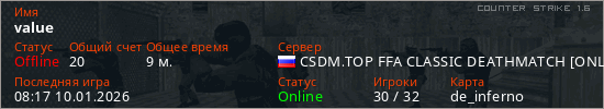 Играет на Counter Strike 1.6 сервере. Страна: РоссияПервый раз замечен 15:00 31.12.2025