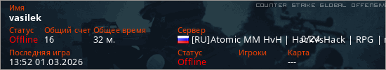 Играет на Counter Strike Global Offensive сервере. Страна: РоссияПервый раз замечен 22:04 21.02.2026