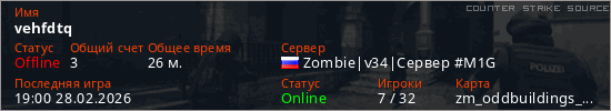 Играет на Counter Strike Source сервере. Страна: РоссияПервый раз замечен 17:08 18.02.2026
