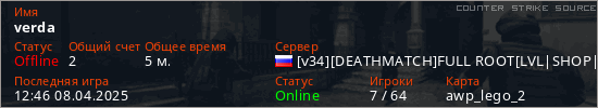 Играет на Counter Strike Source сервере. Страна: РоссияПервый раз замечен 12:41 08.04.2025