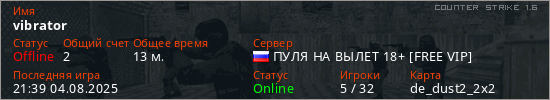 Играет на Counter Strike 1.6 сервере. Страна: РоссияПервый раз замечен 21:51 31.07.2025