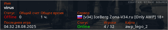 Играет на Counter Strike Source сервере. Страна: РоссияПервый раз замечен 23:07 18.07.2025