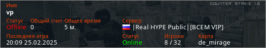 Играет на Counter Strike 1.6 сервере. Страна: РоссияПервый раз замечен 20:05 25.02.2025