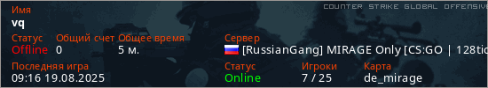 Играет на Counter Strike Global Offensive сервере. Страна: РоссияПервый раз замечен 08:45 19.08.2025