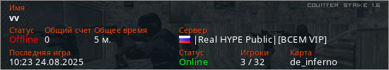 Играет на Counter Strike 1.6 сервере. Страна: РоссияПервый раз замечен 10:19 24.08.2025