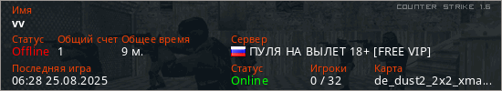 Играет на Counter Strike 1.6 сервере. Страна: РоссияПервый раз замечен 16:23 10.08.2025