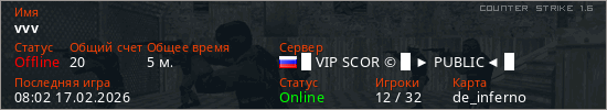 Играет на Counter Strike 1.6 сервере. Страна: РоссияПервый раз замечен 07:20 17.02.2026