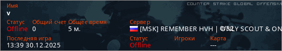 Играет на Counter Strike Global Offensive сервере. Страна: РоссияПервый раз замечен 13:35 30.12.2025