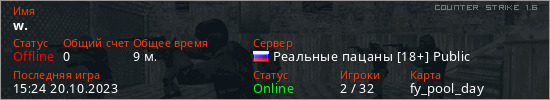 Играет на Counter Strike 1.6 сервере. Страна: РоссияПервый раз замечен 13:29 28.03.2023