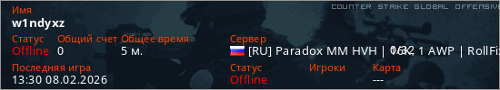 Играет на Counter Strike Global Offensive сервере. Страна: РоссияПервый раз замечен 13:26 08.02.2026