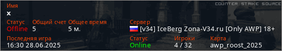 Играет на Counter Strike Source сервере. Страна: РоссияПервый раз замечен 16:24 28.06.2025